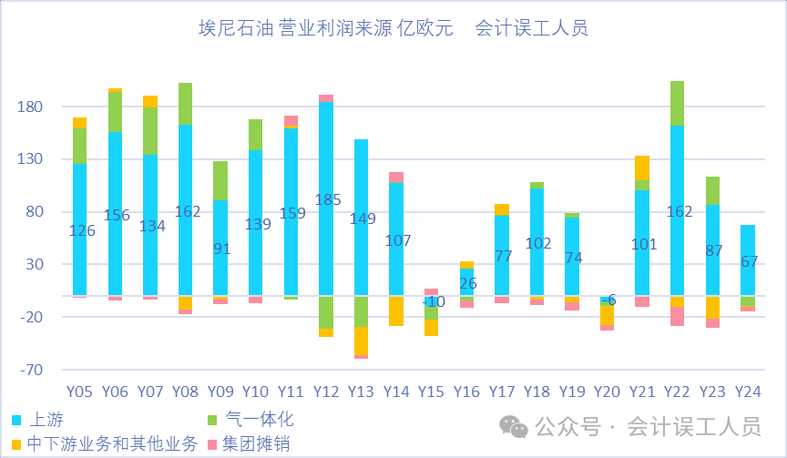 埃尼2005-2024年的过去20年息税前利润2150亿欧元的来源:上游油气的勘探开采+2087亿欧元,其次是天然气一体化+218亿欧元,中下游和其他业务-86亿欧元,集团分摊-70亿欧元。