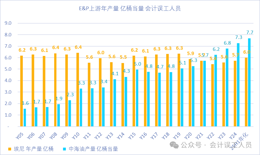 A. 产量:埃尼过去20年的上游产量在高位平台期停滞甚至有些收缩,而中海油的产量从埃尼产量的25%到了今天的1.28倍;