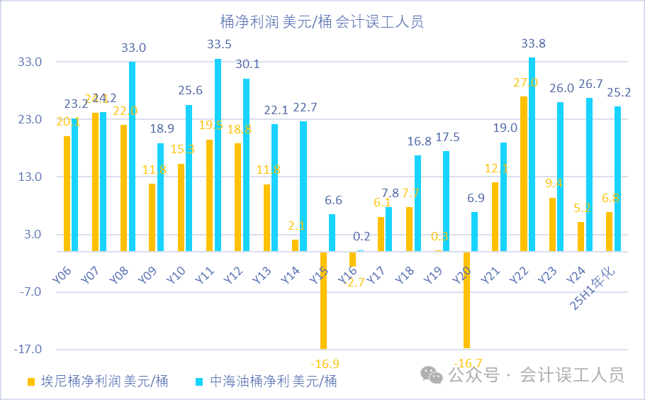 2006-2007年时中海油和埃尼的桶净利润都差不多,2023埃尼的桶利润9.2美元只有中海油桶利润26.0美元的29%,2024埃尼的桶利润4.9美元只有中海油桶利润26.7美元的18%,2025H1埃尼的桶利润6.7美元只有中海油桶利润25.2美元的27%,虽然跟埃尼的中下游这几年也中下游业绩亏损有关,但上游业绩按它的体量依然好不了哪里去,整体资产效率和效益相比中海油就差远了。