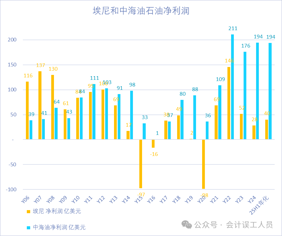 20年前的2005年埃尼的油气产量就达到了6.18亿桶,是当年中海油产量1.55亿桶的3.99倍;中海油的产量直到2022年才超过埃尼石油公司20年前的上游水平。2025年上半年中海油的日产量是埃尼的1.28倍反超,2025H1中海油的净利润97亿美元是埃尼的20.1亿美元的4.8倍。