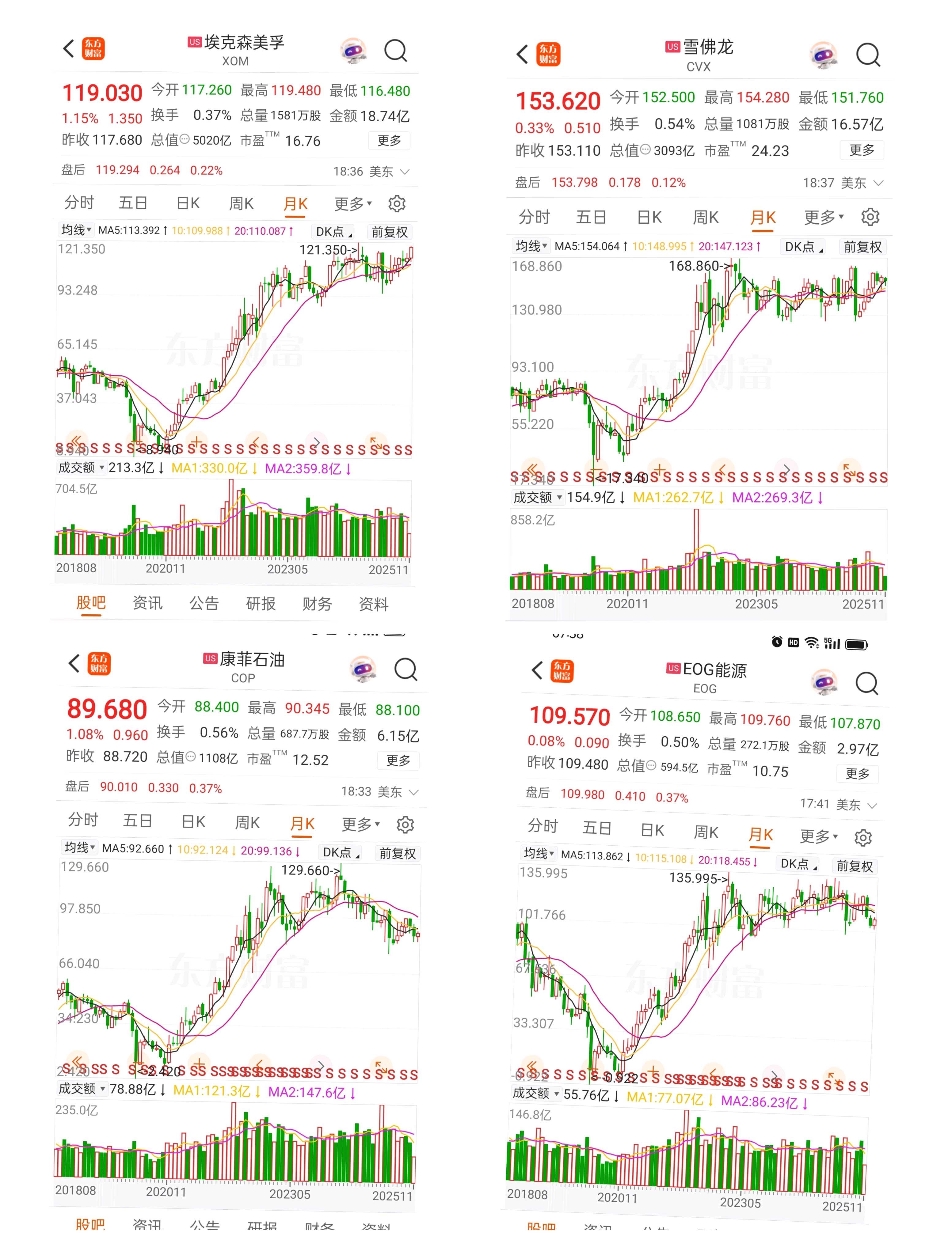 油价从2022年年平均96美元,到2025年至今今年大概平均68美元的油价,期间,美国第四大油气公司西方石油股价大概跌了一半,而美国最大油气公司埃克森美孚的前复权股价今天只差不到2%就历史新高,美国第二和第三大油气公司雪佛龙和康菲几乎比2022年没怎么跌,美第五大油气公司EOG比2022年也是上涨的……