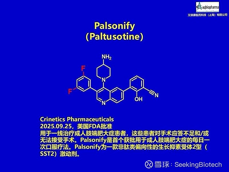 氟(F)药进展:昨天美国时间,FDA批准Crinetics Pharmaceuticals开发的Palsonify(paltusotine)在美国上市,用于一线治疗成人肢端肥大症患者,这些患者对手术应答不足和/或无法接受手术。Palsonify是首个获批用于成人肢端肥大症的每日一次口服疗法。肢端肥大症是由垂体瘤导致生长激素过量分泌引起的,它导致患者的胰岛素样生长因子1(IGF-1)水平升高。Palsonify 为一款非肽类偏向性的生长抑素受体2型(SST2)激动剂。#Seeking# #biotech#