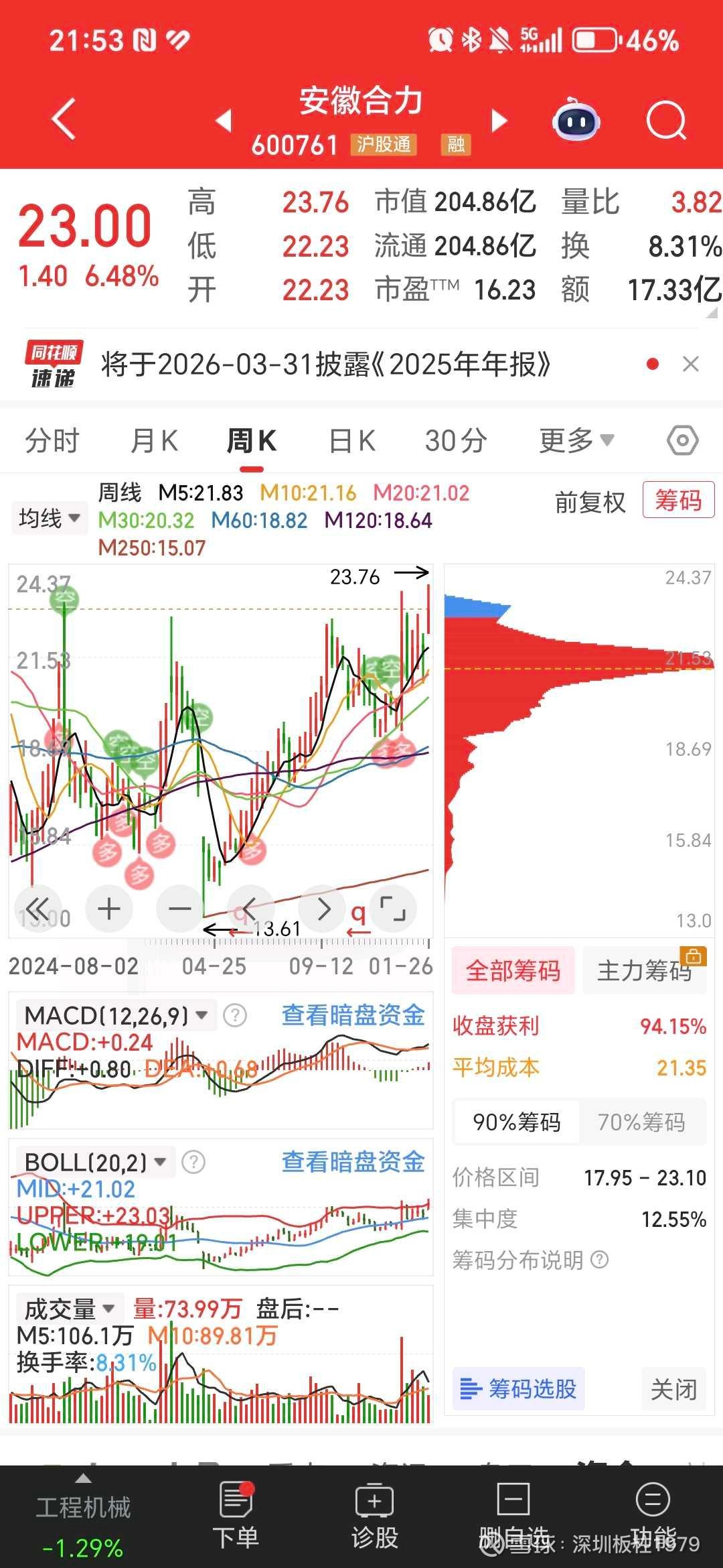 从周线、技术面筛选出安徽合力具备分析价值,分析公司基本面和合理估值: