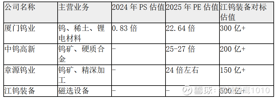 江钨装备整体上市后的估值有望对标行业龙头,考虑到其"资源+新材料"双轮驱动的战略定位,以及江西省国资委的强力支持,PE估值有望进一步提升。