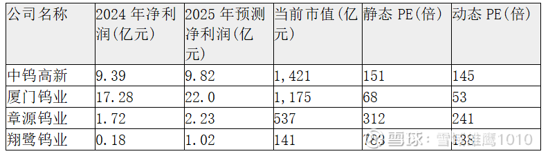 • 资源型公司:如中钨高新(PE约52.7倍)、厦门钨业(PE约68倍)等,估值较高但增长预期相对有限。