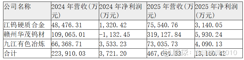 • 赣州华茂钨材:主要从事钨材料冶炼,2025年净利润5,930万元,毛利率较低(约5%),但营收增长显著(从2024年10.91亿元增至2025年31.91亿元)。其盈利能力主要依赖于销量增长和成本控制。