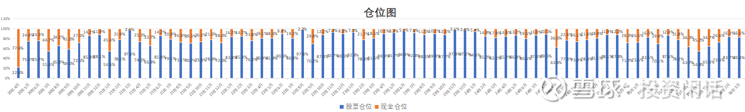 (一)仓位运行情况。我们坚持高仓位、低换手、不加杠杆的仓位管理策略,该产品从2020年4月以来平均仓位79.6%。3月末组合持仓PB0.75,较2月末的0.73略有上升;3月底我们总仓位提升至83.4%,较上个月略有下降。