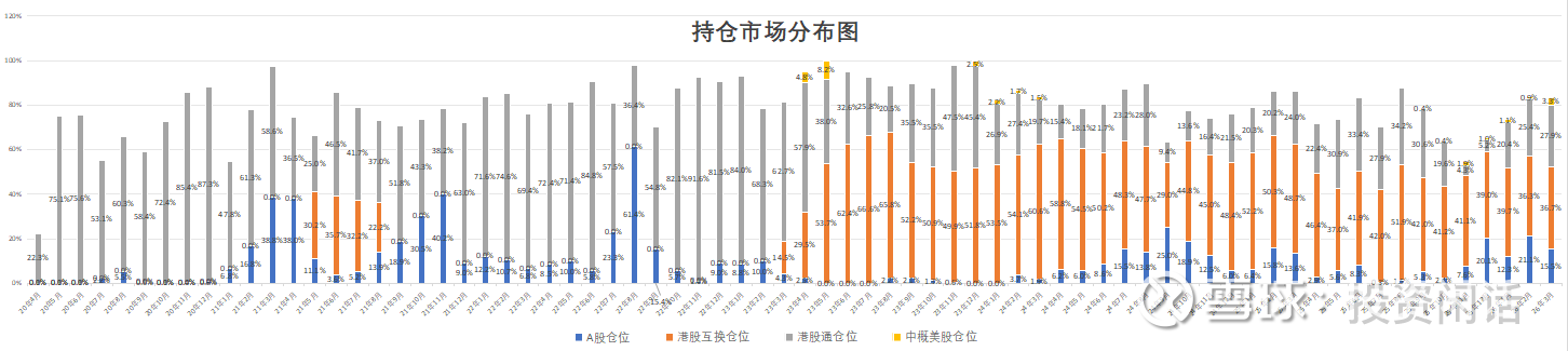 (二)投资市场分布。我们的投资方向以港股为主,2020年4月以来港股和A股平均仓位占比分别为69.3%和9.7%。截至今年3月底,产品持有港股64.5%(通过港股通持有27.9%,通过券商收益互换持有港股36.7%)、A股为15.5%、中概美股为3.3%。