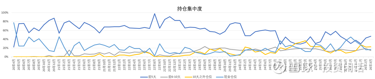 (三)持仓集中度情况。过往我们的持仓集中度相对较高,前五大和前十大持仓的集中度均值分别为59.7%和70.7%。从我们2024年起逐步降低持仓集中度,2024年和2025年前五大持仓占比月度均值分别为50.2%和40.9%。目前产品持仓55只,前五大和前十大仓位占比分别为46.4%、60.6%,集中度较上个月略有提升。