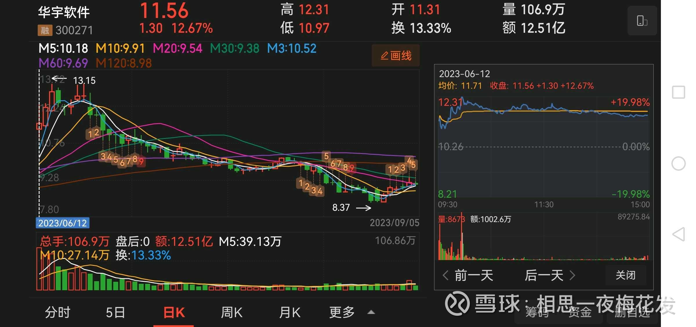 公告发布后,华宇软件股价高开高走,6月12日盘中一度触及20CM涨停,最终报收11.56元/股,涨幅12.67%;6月13日,华宇软件延续涨势,报收12.19元/股,涨幅5.45%,之后两天,继续大涨,最高到13.15元,四天时间涨幅高达35%!