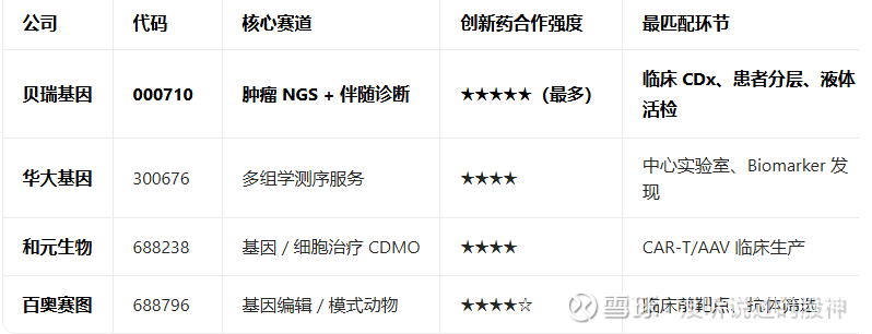 按 A 股上市公司筛选,与创新药(尤其伴随诊断、靶点筛选、临床检测)合作最密集、最核心的基因技术公司主要是以下几家: