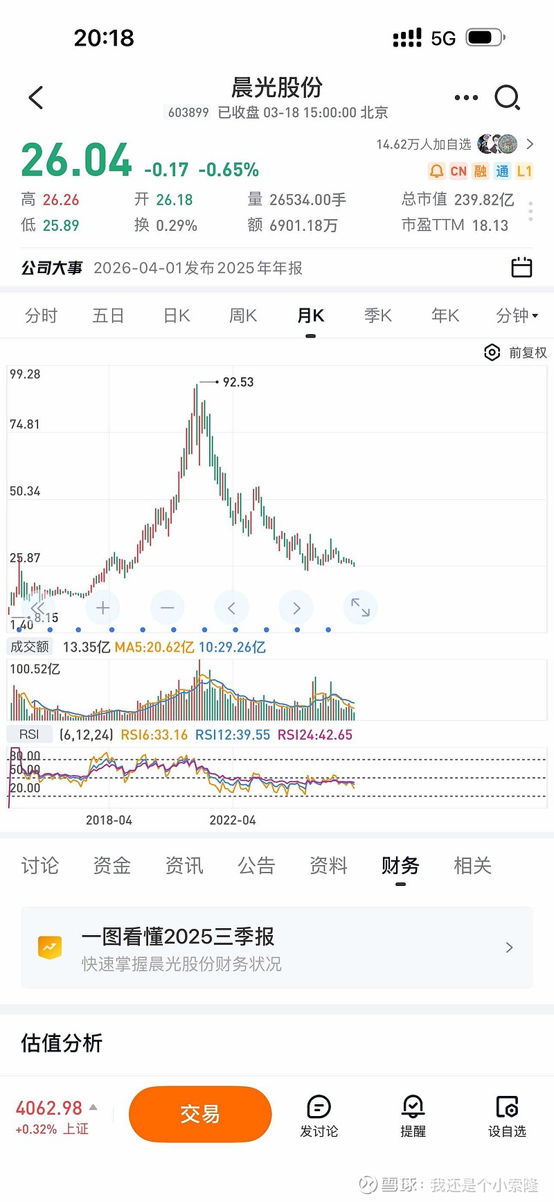 $晨光股份(SH603899)$没想到当年的中国核心资产那一波,就是晨光的最高点。连续多年的高 roe25% 以上。到 24 年只有 16.64% 了。还是无法逃离人口负增长的最大基本事实。看了下分红,截止 24 年一直都是增长的。目前 PB2.69,股息率 3.82%。PE18.13。估值不算高了