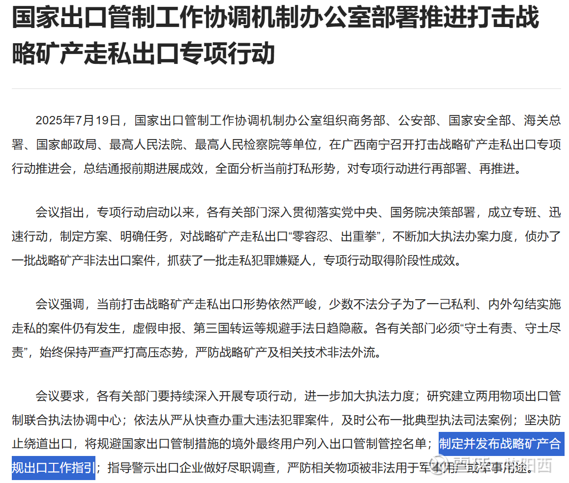 (1)出口量何时能大量恢复?得看指导文件《战略矿产合规出口工作指引》何时发布,发布之后各条线的工作人员才好审批。7月19号说正在制定中,耐心等待吧