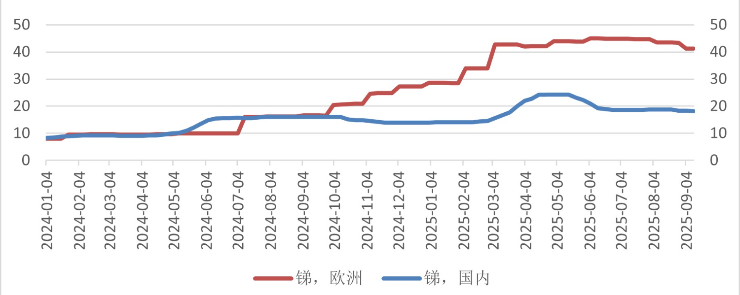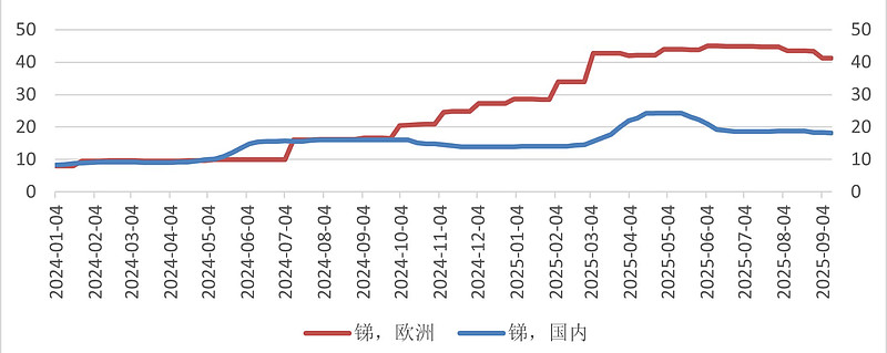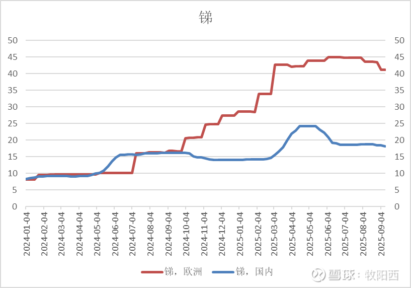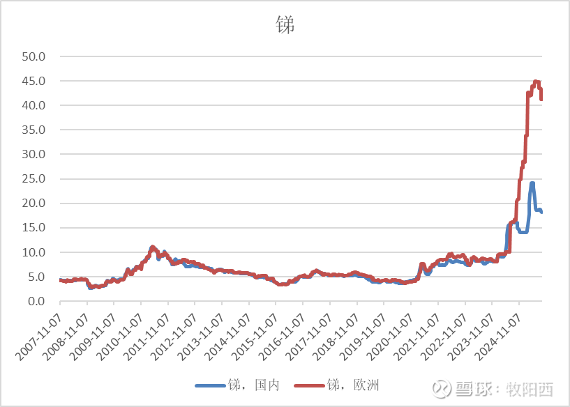 如前文所述,锑钨镁钽铬:五大小金属走到什么位置了?锑价此前长期横在10万以内,国内外价格也长期一致。而2024.07-2025.03,欧洲价格暴涨4倍,而国内价格只涨1倍到18万,主要是我国的出口管制政策影响了内外供需。