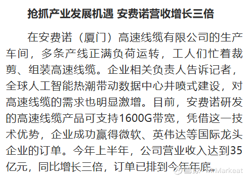 作为Ai硬件的供应商,恒丰特导的前景无疑是巨大的,根据沃尔核材的披露,上半年乐庭高速线缆业务增速为400%。根据厦门新闻网披露,厦门安费诺的高速线缆组装营收也增长了三倍。
