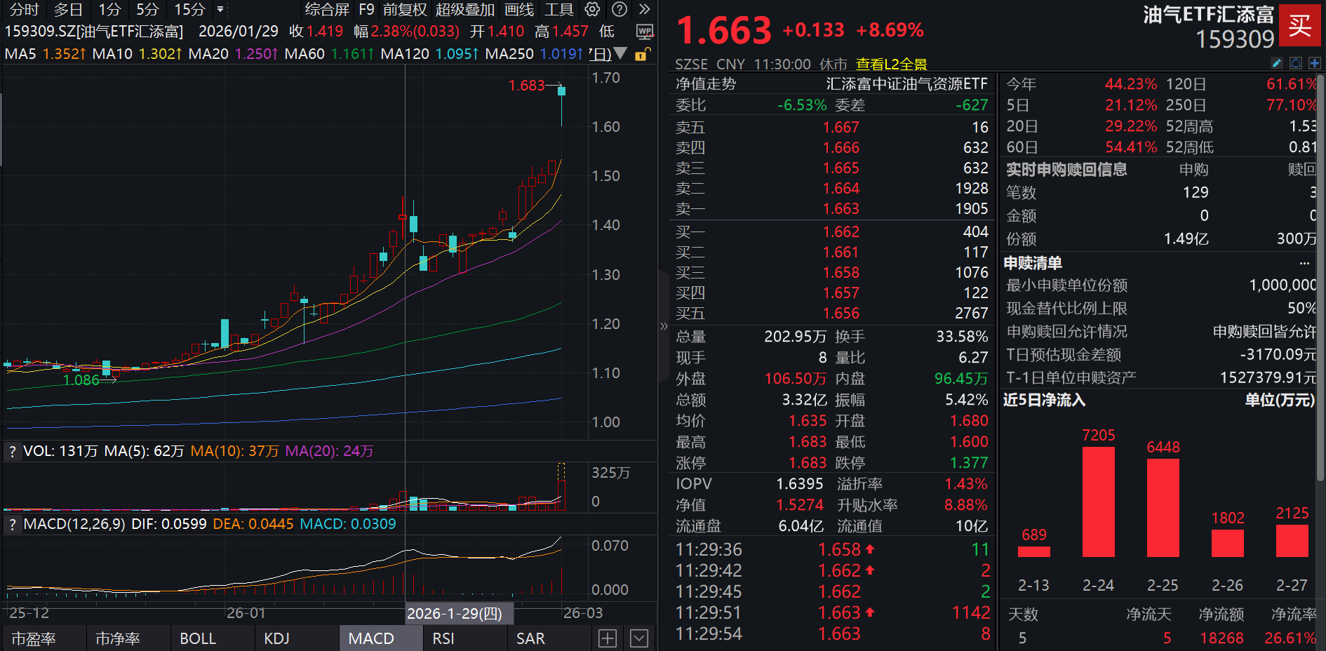近期,全球金融市场的目光再度聚焦中东。随着周末美以与伊朗的冲突骤然升级,作为全球石油供应的“大动脉”——霍尔木兹海峡正面临前所未有的封锁风险。在这一背景下,油气ETF汇添富(159309) 凭借其高纯度、高弹性的油气股和油运股全面布局,上午大涨8.69%并且一度触及涨停,成为市场资金追逐的焦点, 半日吸金已达2.4亿元,资金面和行情面双强!