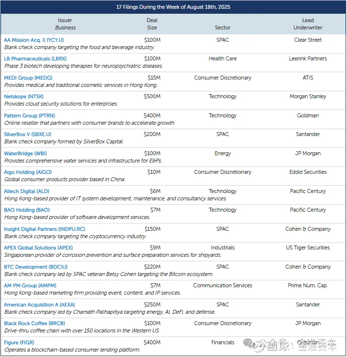 网络安全公司Netskope ( NTSK ) 领衔上周新股发行,申请IPO估计可筹集5亿美元,其次是区块链驱动的贷款机构Figure ( FIGR )、在线经销商Pattern Group ( PTRN )、咖啡连锁店Black Rock Coffee ( BRCB )、神经精神病学生物技术公司LB Pharmaceuticals ( LBRX ) 和 E&P 基础设施服务提供商WaterBridge ( WBI )。他们加入了更多为秋季潜在IPO做准备的大型发行人行列,其中包括最近提交申请的公司(GEMI、LGN、VIA)和正在筹备中的老公司(KLAR、STUB、HMH)。