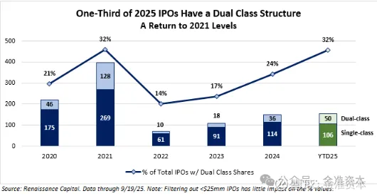 今年有所回升,迄今已有50家发行人(32%)以超级投票权股份上市。这一趋势似乎将在秋季持续下去,上周四家大型申报公司中有三家展示了双重股权结构:费用软件销售商Navan(NAVN;30:1)、加密平台BitGo(BTGO;15:1)和税务咨询公司Andersen(ANDG;10:1)。