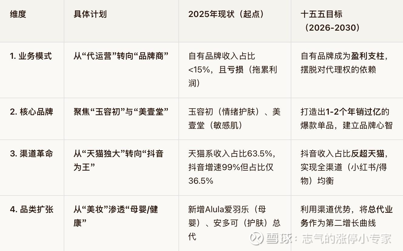 丽人丽妆的转型计划非常明确,核心就是“两条腿走路”:左手做自有品牌(玉容初/美壹堂),右手做全渠道总代。但现实是两条腿目前都“瘸”着,十五五前半段(2026-2027)大概率还是“流血续命”的阵痛期。丽人丽妆(605136)高管层对公司运营的影响已从“业务转型”演变为“控制权与治理危机”。核心结论是:实控人的“家事”已实质性威胁到公司战略的长期执行。