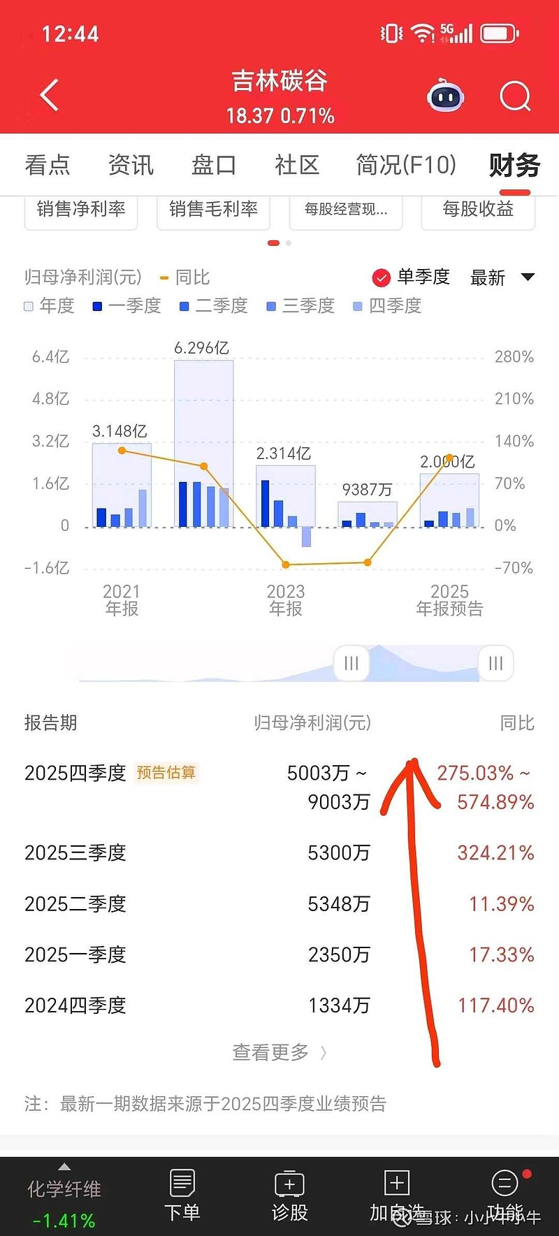 公司2025年第四季度八千万利润,碳纤维每个季度销量基本稳定,一季度再有提价,利润应该在一亿左右,如果产品在今年再次提价,2026年全年利润5+亿是确定的,利润最高到多少,取决于产品提价次数或幅度,也许五六亿,也许七八亿,都有可能。利润最高点是明年,股价最高点会提前到来,至于何时是股价最高点,未来才知道。$星辰科技(BJ920885)$ $蘅东光(BJ920045)$