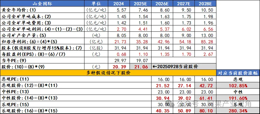 1、金价:2025年年初至今黄金均价为746元/克,我们以此假定为全年均价;当前金价已经来到850元/克,我们假定这个价格横盘一年,2026年黄金均价为860元/克;此后2027、2028年黄金均价年上涨仅仅10%,分别为950元/克、1050元/克。可以看出,对于金价的预期已经相当保守,任何价格超过这个预测,都是超预期的收益。