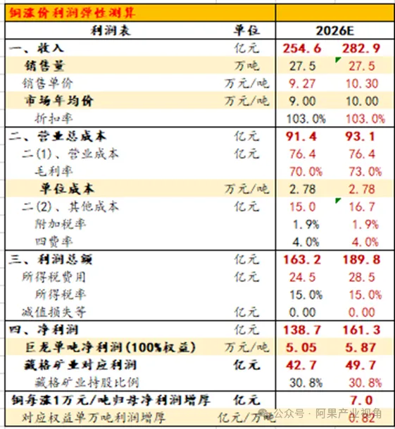 4、税率:巨龙铜矿当前享受税率减免政策,所得税率仅9%,这也使得巨龙铜矿的完全成本极低,该政策暂行至2025年底,暂未出台正式延续文件。我们暂不考虑延续,2026年后巨龙铜矿的所得税率恢复至15%,该税率政策目前至少延续至2030年。