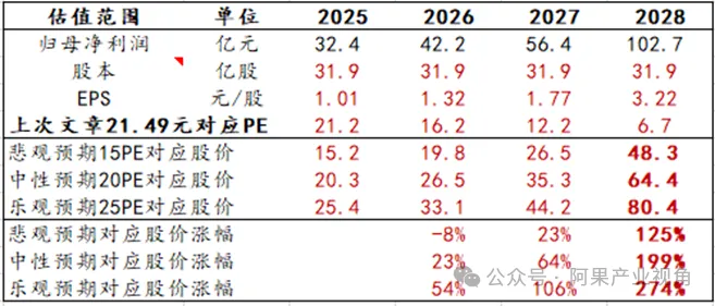 以我们之前发文时21.49元为基准,以15、20、25PE分别为悲观、中性、乐观假设,至2028年对应股价分别为48、64、80元,较基准股价涨幅分别为125%、199%、274%。即悲观情况之下,股价有三年一倍潜力。