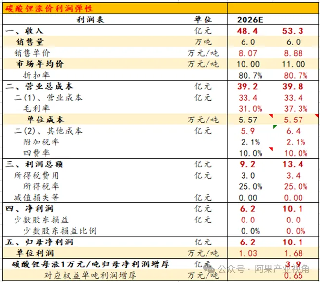 2、价:以碳酸锂价格为基准,2026-2028年碳酸锂价格分别为10、11、12万元/吨(后文有碳酸锂不同价格的利润弹性测算)。