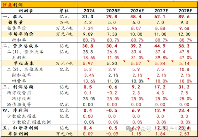 1、量:2025-2028年公司自产锂盐产量分别为5.0、6.0、7.0、9.3万吨。