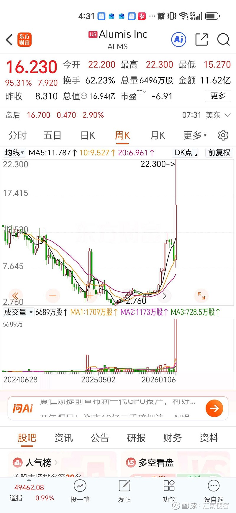 个人第一支一天涨接近一倍的股票-Alumis,收盘时跌到100%以下,不过差不多意思了,接下来就等着这家公司被收购了