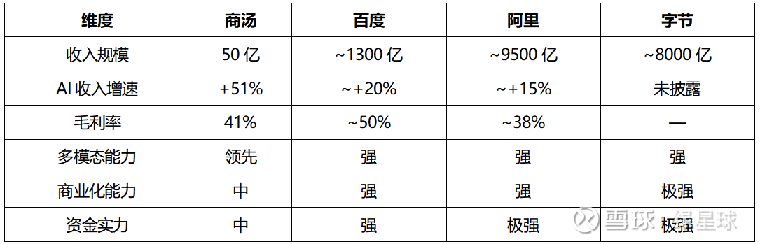 商汤的优势在于原生多模态技术路线和细分场景的商业化,劣势在于规模和资金实力远不如巨头。