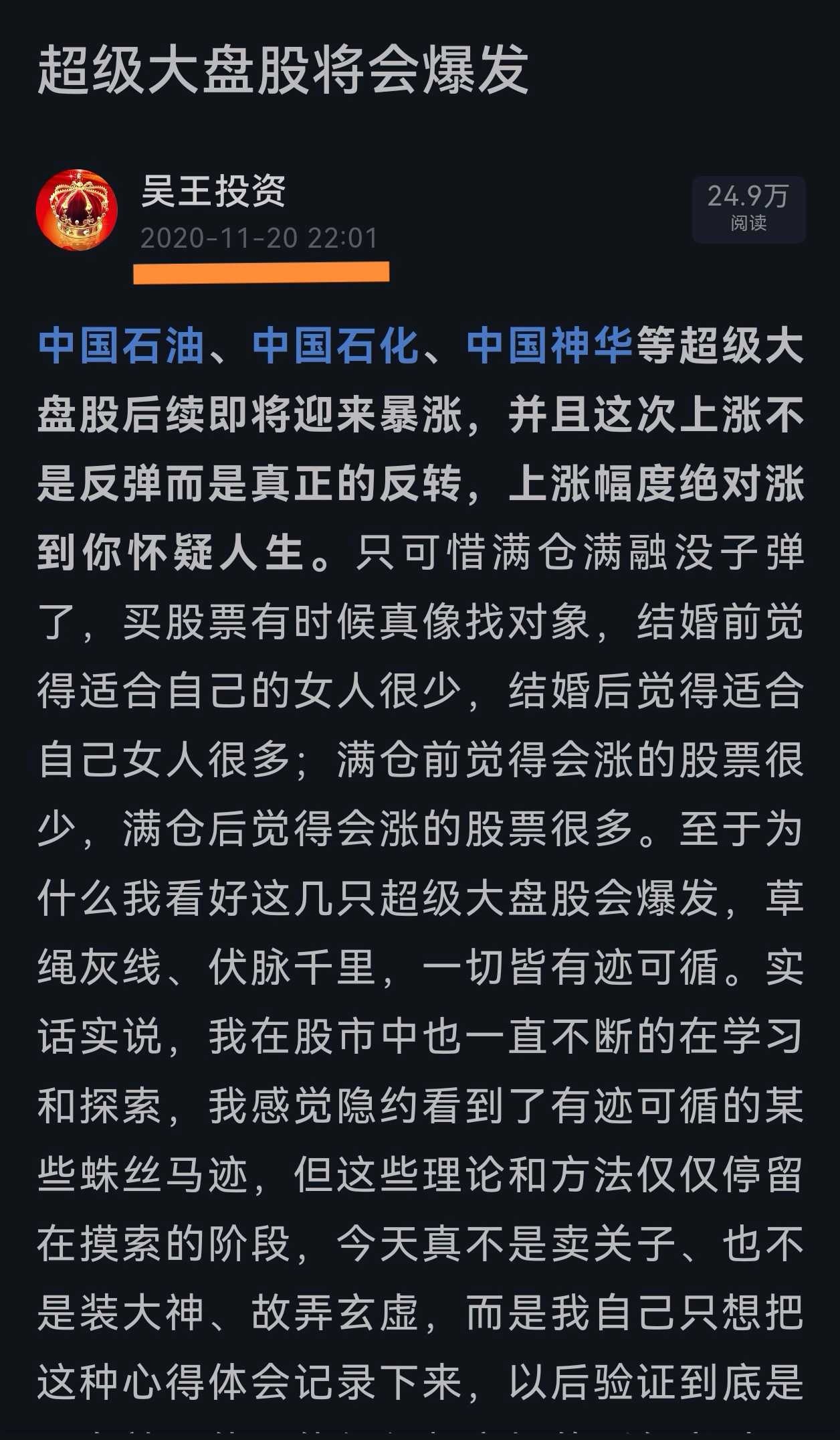 2020年我文章中说到中国石油、中国石化(当时中国海油还没在A股上市)中国神华等超级大盘股将会爆发。