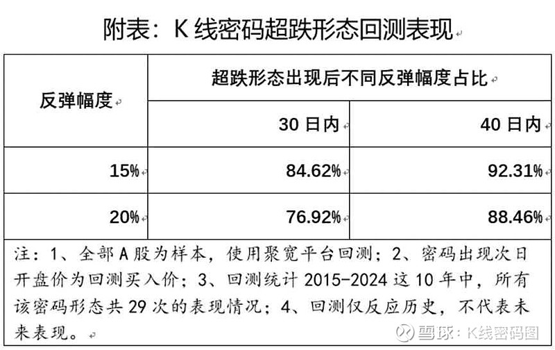 K线密码是K线形态的看涨策略,根据聚宽平台2015-2024这10年的回测表现,此类密码形态出现后40日内,反弹超过20%的概率为88.46%。具体回测数据见附表。(历史数据不代表未来,不构成投资建议,据此投资,风险自负)