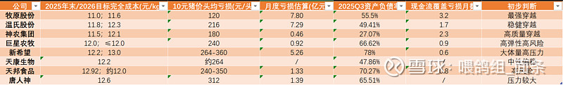 2025年四季度以来,生猪行业已从微利转入深度亏损,2026年3月全国外三元猪价已降至10.3-10.5元/公斤,部分地区跌破10元/公斤,而行业中性完全成本仍约12.5元/公斤,上市猪企平均成本约13.08元/公斤,头部企业也大多仍在11-12元/公斤以上。这意味着在10元/kg价格下,绝大多数企业不仅利润为负,很多企业甚至已经逼近或跌破现金成本线,每出栏一头猪都在消耗现金,而不是单纯摊薄固定成本。