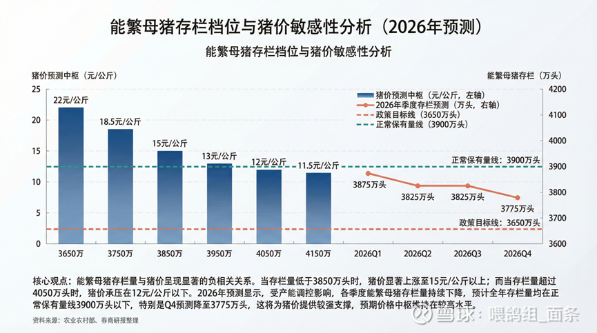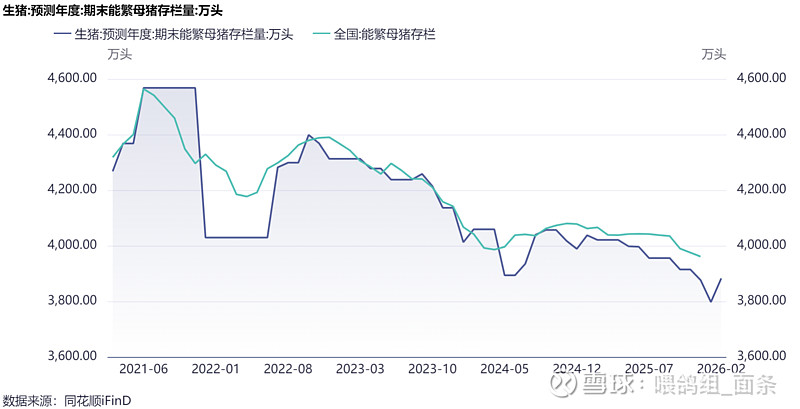 2025年末3961万头,当前预测2026上半年围绕3900‑4000万头缓慢回落,下半年有望下探至3750‑3850万头区间,距离(反内卷)政策新目标3650万头仍有明显差距。
