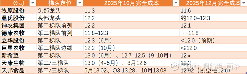 2025年自繁自养平均成本为13.08元/kg,同比-6.6%,而自繁自养盈利平衡价线约在13.15元/kg,上市企业成本12元/kg附近。