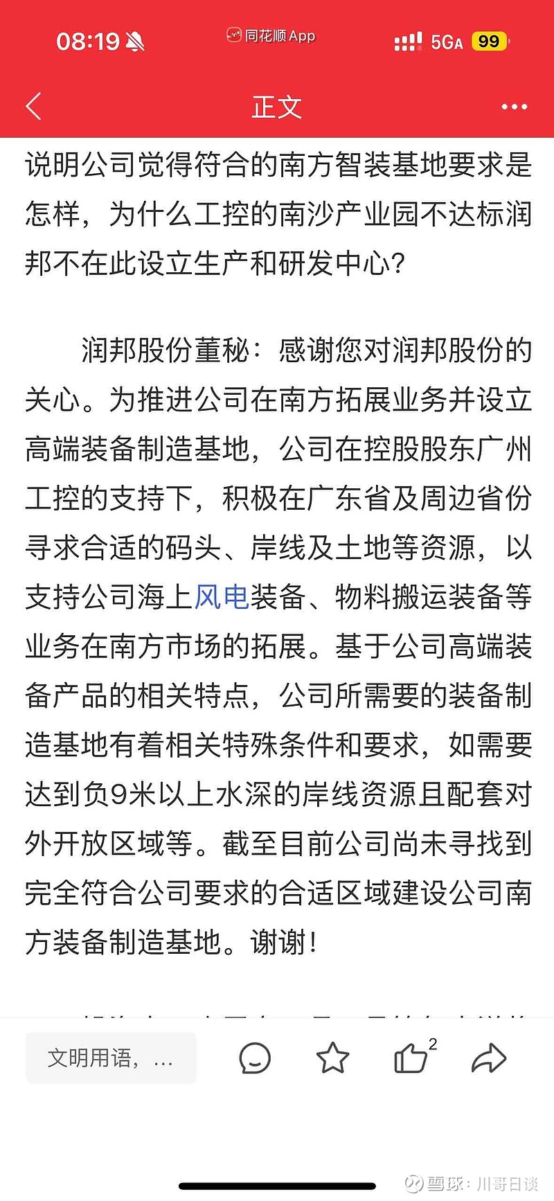$润邦股份(SZ002483)$三季报投资活动净现金流出1.9亿,主要是南方海工基地建设还是通州湾?昨天董秘说南方海工基地还没选好址,那就是说即便业务好转,利润增加,还是会持续受投资影响。再加上刘春山的坏账还没要回来。这公司啥时候能反转啊