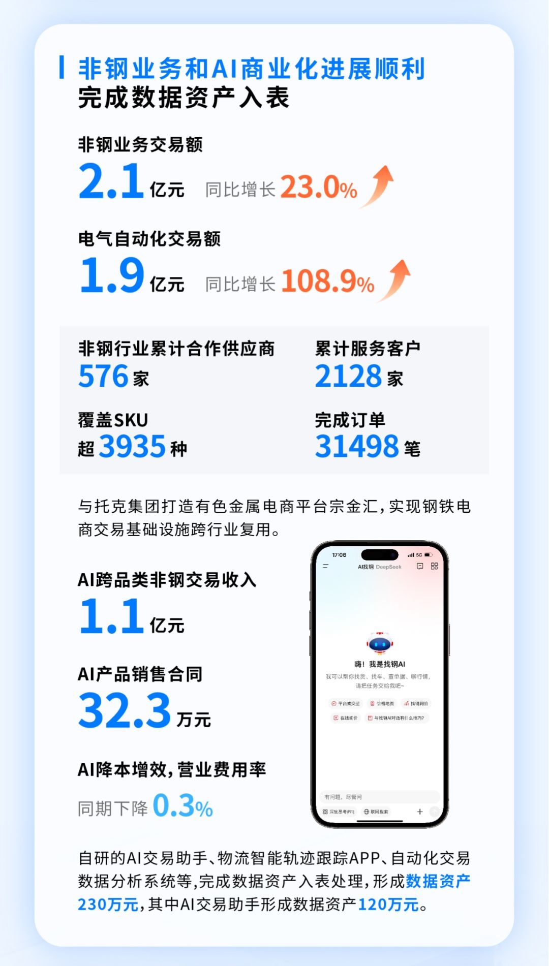 与此同时,找钢集团对自研的AI交易助手、物流智能轨迹跟踪APP以及自动化交易数据分析系统等核心数据资产,开展了数据资产入表处理,集团形成数据资产230万元,其中AI交易助手形成数据资产120万元。