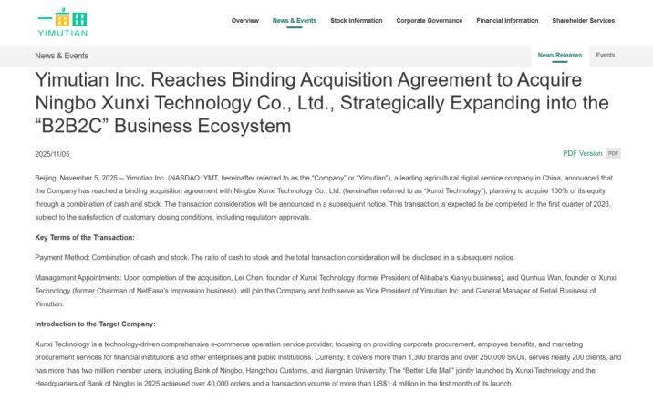 据IPO早知道消息,一亩田集团(NASDAQ:YMT)日前发布公告称,与讯喜科技达成约束性收购意向,计划以现金+股票的形式收购其100%股权,交易对价待后续公告。本次交易预计将于2026年第一季度完成,尚需满足包括监管审批在内的惯例交割条件。本次收购交割后,预计将在首个完整财年对公司营收及每股收益产生显著积极影响。