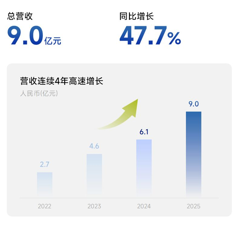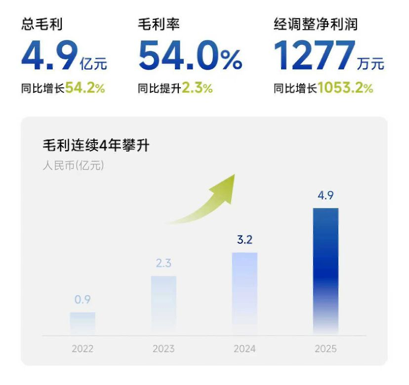 财报显示,2025年卧安机器人全年营收9.0亿元,同比增长47.7%;毛利为4.9亿元,同比增长54.2%,毛利率进一步提高到54.0%;经调整后净利润增逾10倍,达到1277万元。