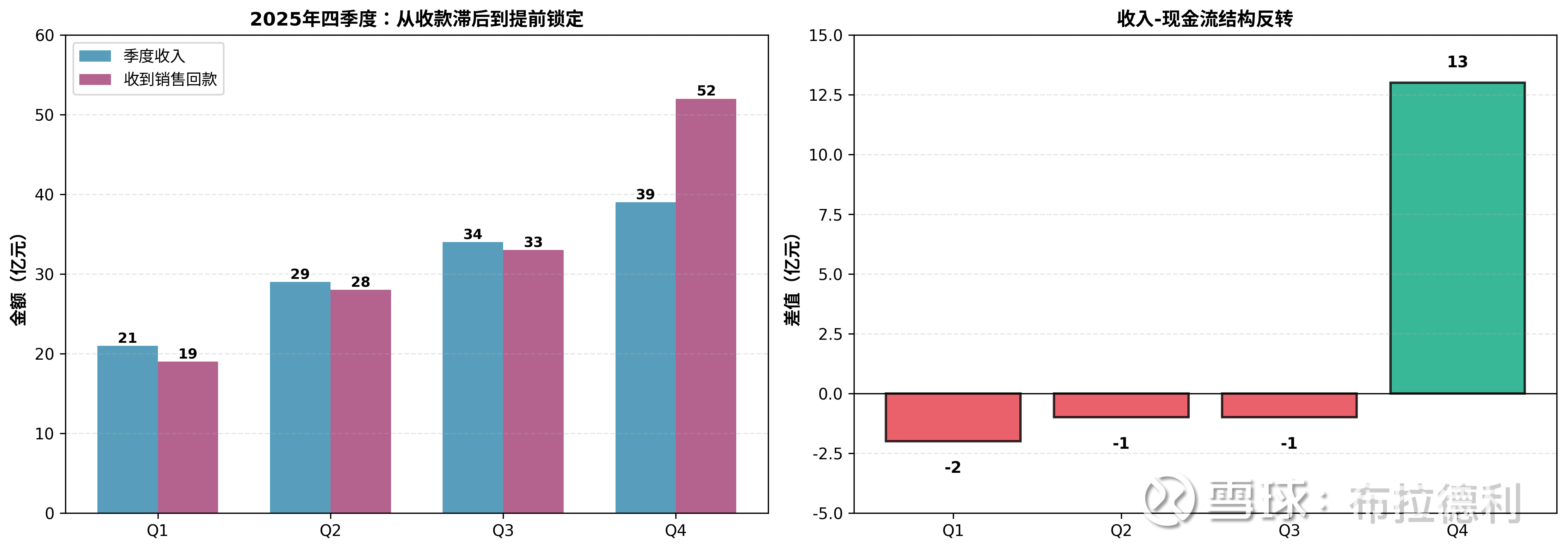 截至Q3,经营性现金流都还是负的,但Q4一举实现净25亿。对比单季收入与销售现金流: