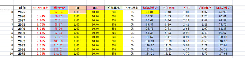 如果稍微乐观一点的话,PB维持在1.0倍不变,ROE维持10%不变,分红比例和上例相同,那么预期的年化收益率又会是多少呢?