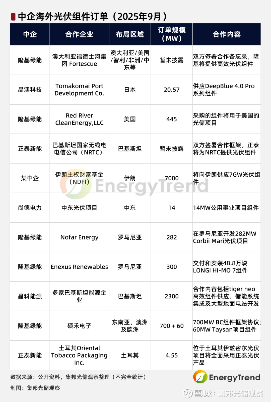 其中,某未披露名称的中国光伏企业斩获伊朗7GW光伏组件大单,隆基绿能以5笔订单成“签约王”,晶科能源拿下巴基斯坦2.3GW大单,头部企业领跑态势显着。(文末附9月海外组件订单列表)