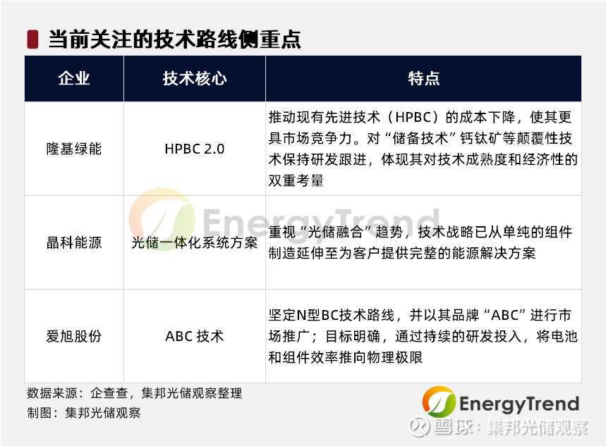 集邦光储观察获悉,近日,三家光伏头部企业隆基绿能、晶科能源和爱旭股份先后举办交流会,各家从市场需求、技术路线、海外战略等方面进行了说明。