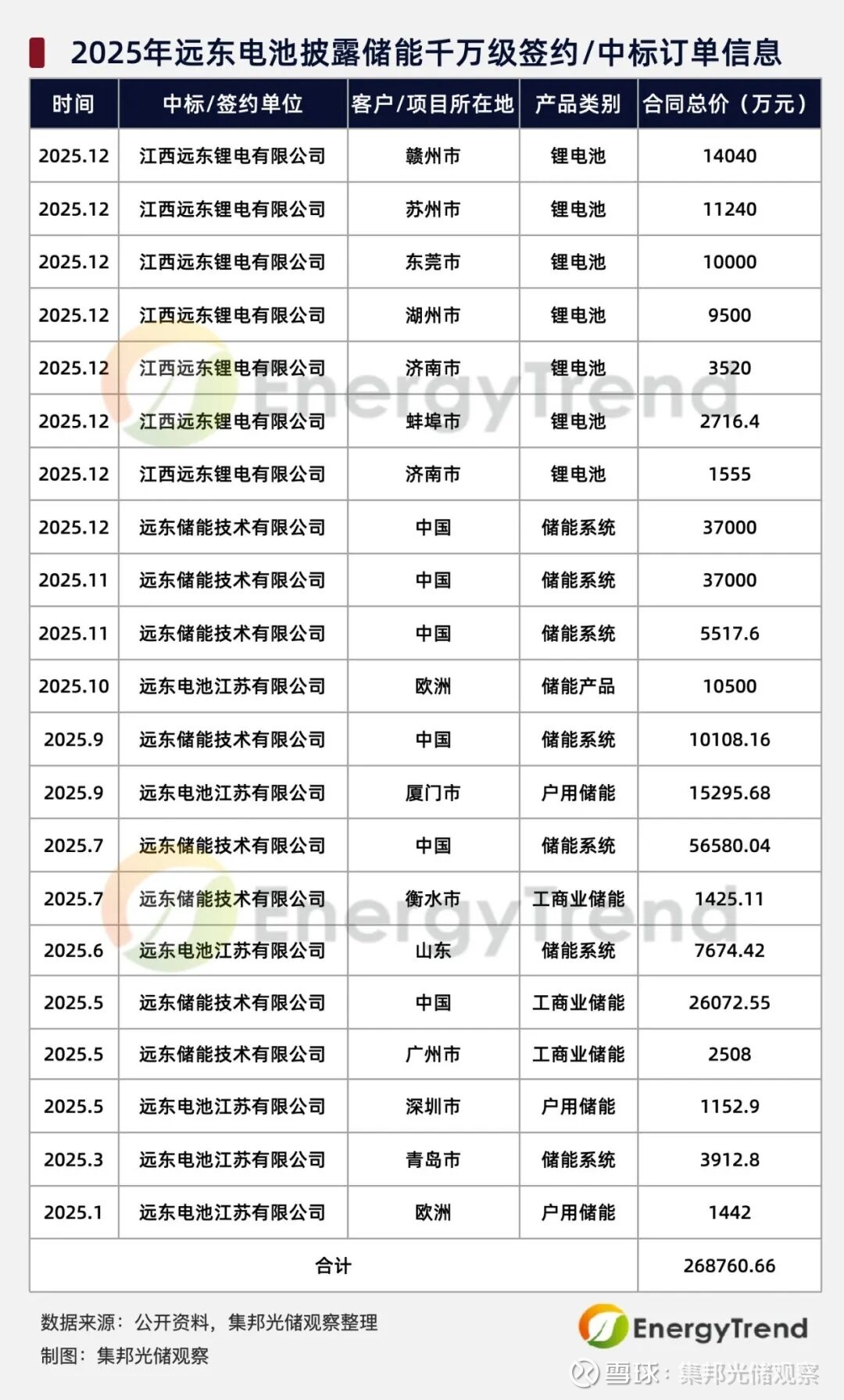 据集邦光储观察整理,2025年远东电池已披露的千万级储能订单共计21起,累计金额达26.9亿元。
