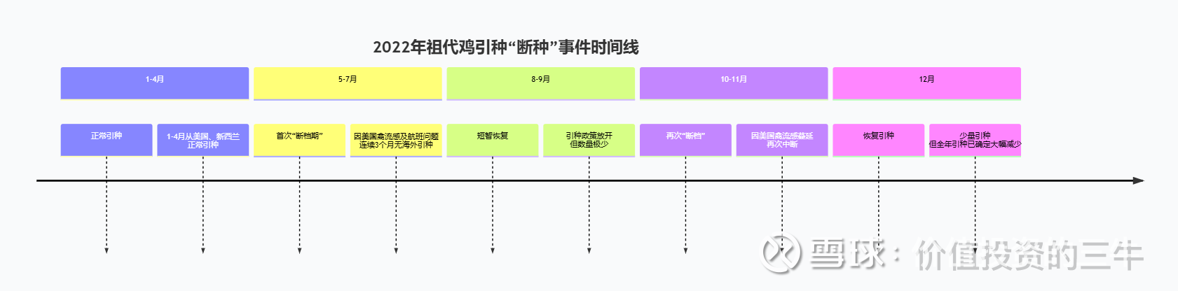 1-4月正常引种1-4月从美国、新西兰正常引种5-7月首次“断档期”因美国禽流感及航班问题连续3个月无海外引种8-9月短暂恢复引种政策放开但数量极少10-11月再次“断档”因美国禽流感蔓延再次中断12月恢复引种少量引种但全年引种已确定大幅减少2022年祖代鸡引种“断种”事件时间线