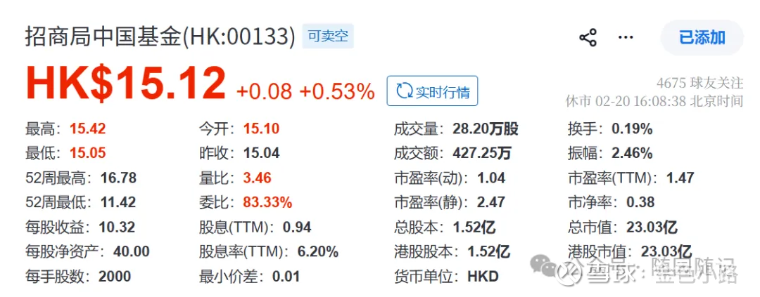截至2025年12月31日,招商局基金的总资产为10.57亿美元,有息负债0。大部分负债为递延税款。净资产约为8.49亿美元, 折合每股5.558 美元(43.33 港元)。按现价15港元计算,仅3.46折。多年来公司分红在0.08-0.12美元之间。属于低估的红利股公司。