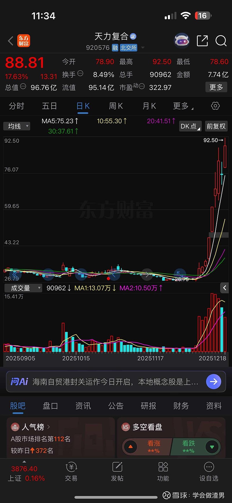 $天力复合(BJ920576)$ 对于今天来北证的主力资金真无语,北证今天量本来就不大,你还花了几个亿去拉星辰科技,非要搞独立,你用几千万早盘就能引导天力复合上板了,把天力引导上板,星辰自然也不会差,这下好了,被砸懵了吧,星辰上面那么多套闹盘需要你去解放,就算你今天给封板了,我看明天谁去接你们的盘,非要搞到两败俱伤才满意,天力复合不大涨星辰科技铁定也好不到哪里去,历史地位没天力高,筹码结构也没有天力好,也没有天力家人们团结,天力复合目前是公认的商业航天总龙头,主力资金你抓紧收手吧!