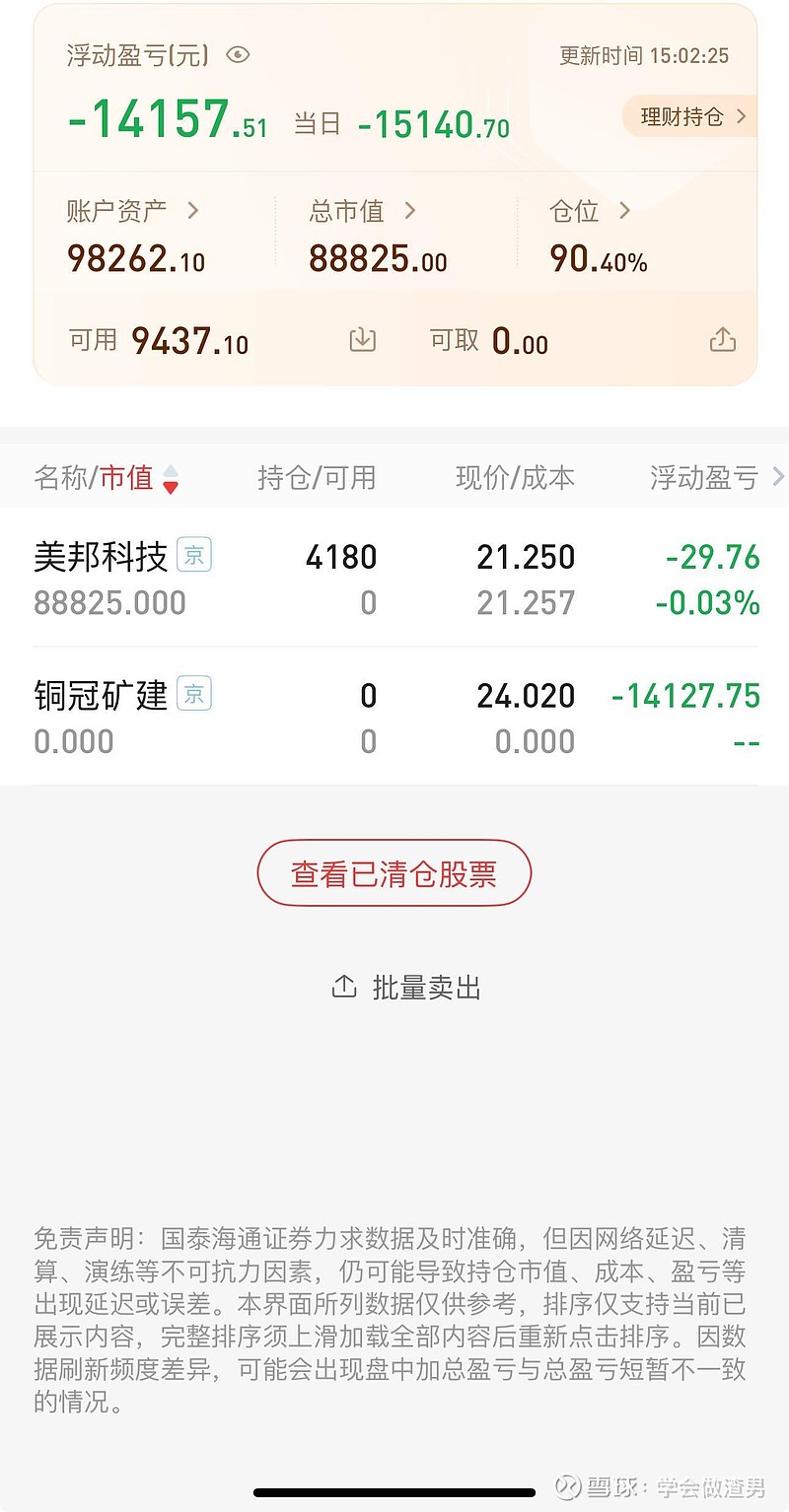 $美邦科技(BJ920471)$实盘第36天计划过年前本金翻倍(46万)!本金23万今日亏损1.5万元,资产9.8万元又是一个没有按照计划执行的一天看着早盘有色 贵金属大跌计划竞价就割的 但没有执行尾盘才割盘后竞价全仓买入美邦科技还有一点没有成交到这后半个月 太难做了几次好风口买卖点没有踩对导致账户腰斩的确需要反思下祝大家周末愉快!