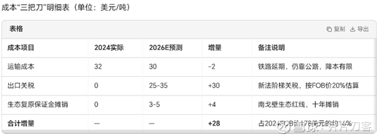 以2024年FOB价格178美元/吨为基准,单位成本增加28美元/吨,相当于税后利润减少约0.9亿美元,占2024年净利润的65%。